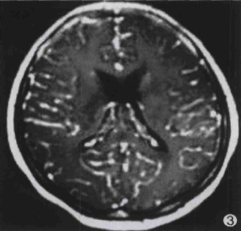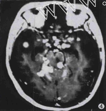 ②未成熟期4例,共34个病灶,病灶周围见3.0~8.0cm的水肿带,其中12个达8.0cm ,T1WI呈等或略低信号,T2WI呈高信号,增强后呈均匀结节状强化。