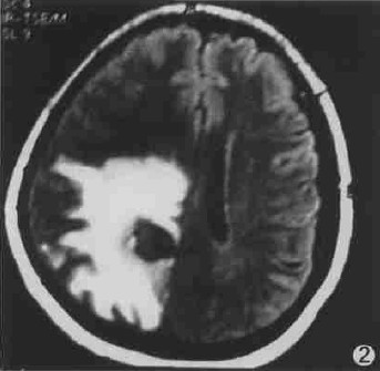 图2 右侧顶叶脑结核瘤内以长T1长T2信号为主的混杂信号,瘤周水肿较重。